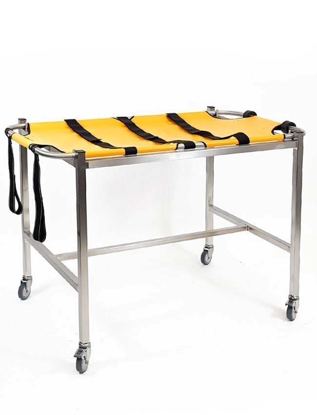 Barella per animali con montatura in acciaio inox e telaio in PVC resistente, dotata di tre cinghie laterali con chiusura a velcro per mantenere il paziente in posizione, impugnatura regolabile, dotata di due ruote. Misure: 61x123cm. Posizionata su carrello in acciaio inox Aisi 304 con ruote (2 con freno). Dimensioni carrello: 100×65,5×85,5hcm