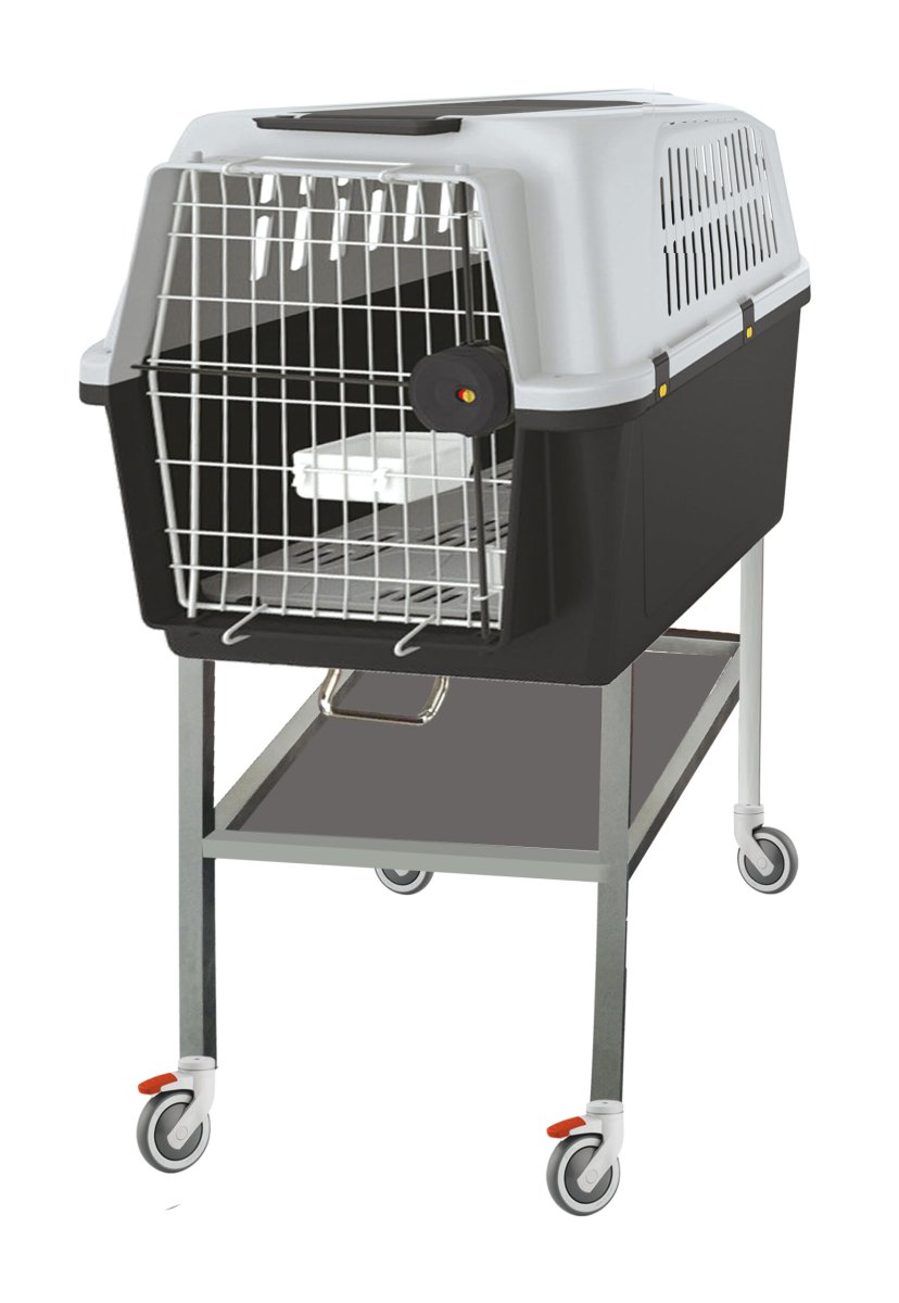 Barella di emergenza per trasporto di gatti con carrello realizzato in acciaio inox su ruote, di cui due frenanti. Parte superiore in resina termoplastica, porta in acciaio plasticato con serratura di sicurezza. Dim. box: L61xP91xH66,5 cm Dim. carrello: L59xP89xH78 cm