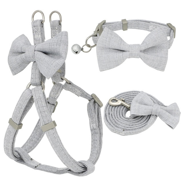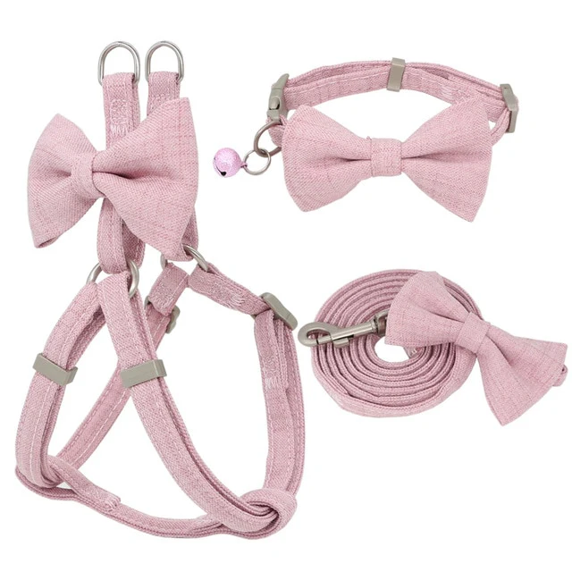 Type: Pet harness, leash, collar set Material: CottonFeature: Adjustable, Breakaway, Quick ReleaseColor: Khaki,Pink,Blue,Gray,YellowSuitable for: Cat,Puppy, Small Medium PetSize: S / M Note: It is manual measurement, there may be 1-3 cm error. And item color displayed in photos may be showing slightly different on your computer monitor since monitors are not calibrated same.