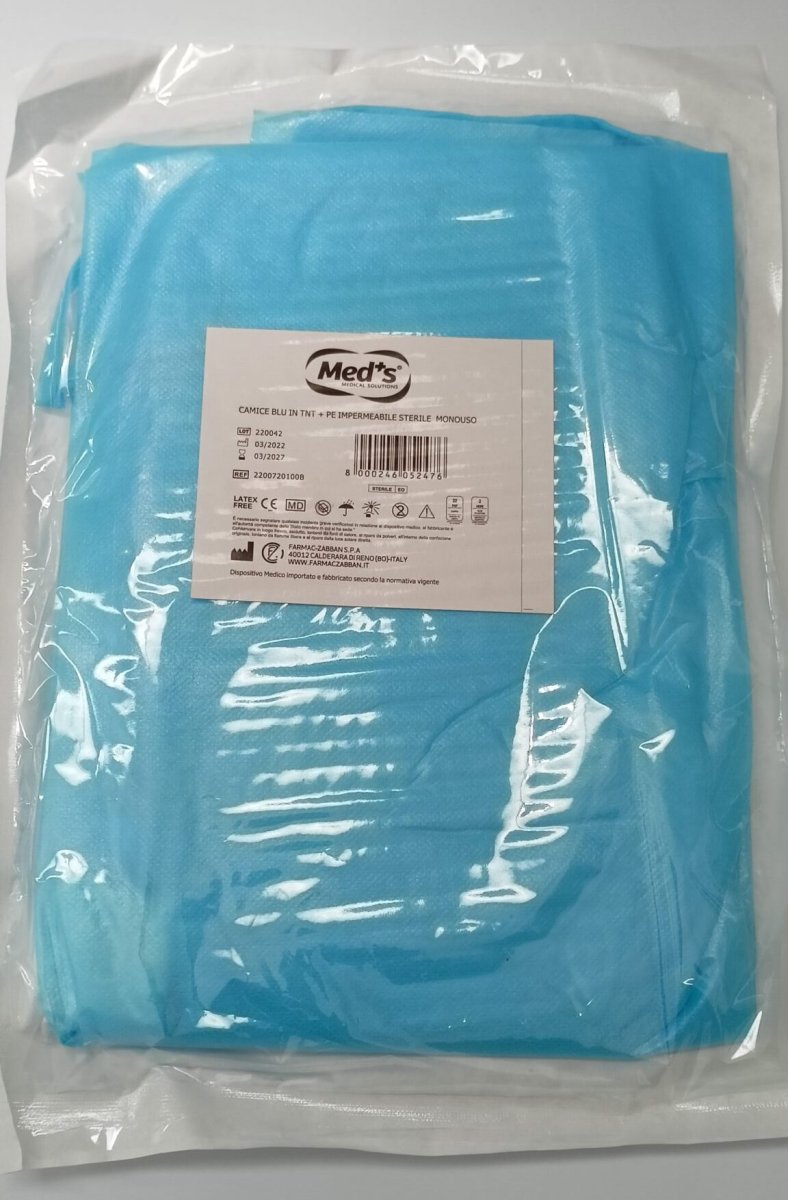 Camici azzurri in tnt+pe impermeabili con polsini e cintura in vita. Disponibili sterili e non sterili. Confezione 10 pz