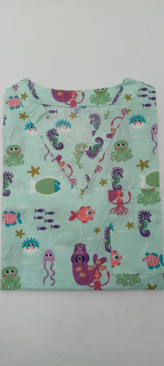 Casacca green medico verde pesci di mare in cotone e poliestere con due tasche e taschino porta penna. Varie Taglie: XS lunghezza tot. 71,5 – petto 108, S lunghezza tot. 73- petto 113, M lunghezza tot. 74,5- petto 118, L lunghezza tot. 76 – petto 123, XL lunghezza tot. 77,5- petto 128