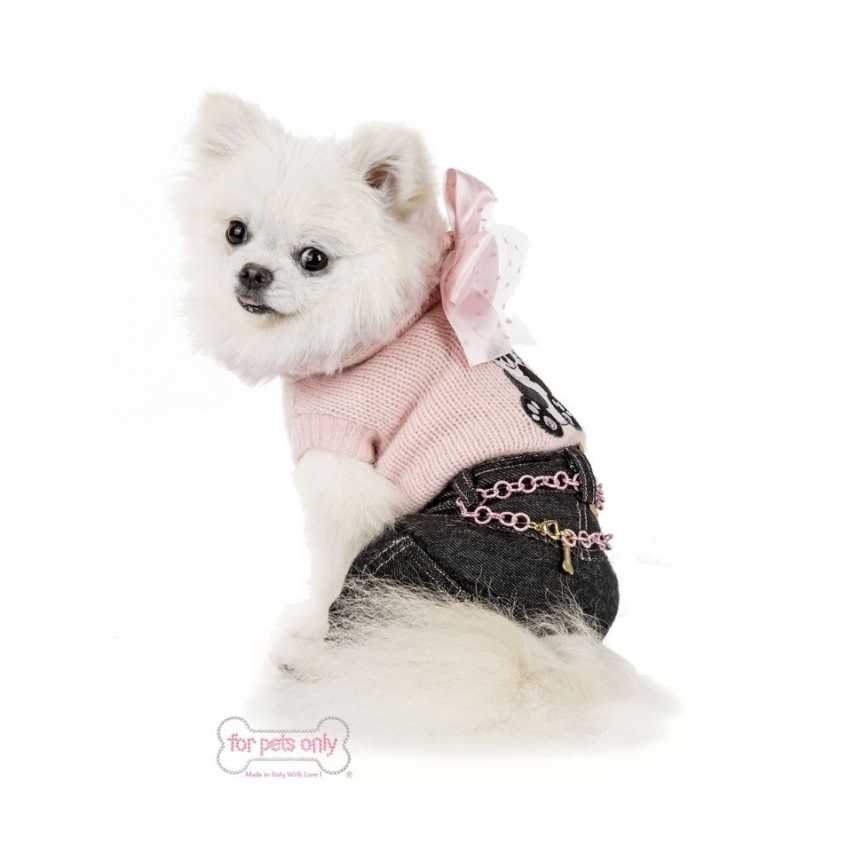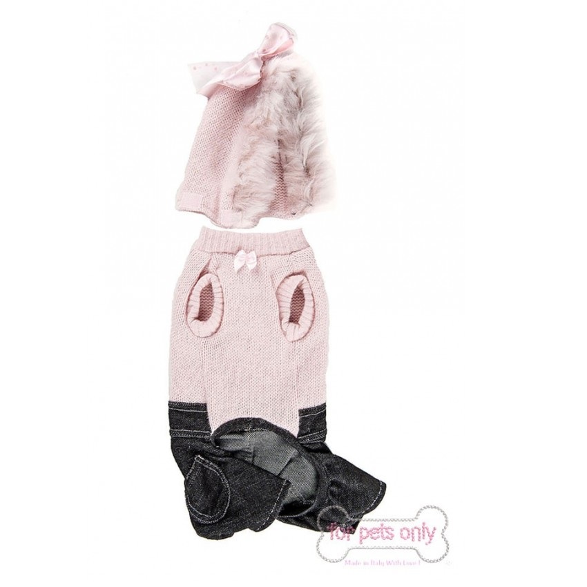 Dolcissimo quattro zampe in jeans e morbida lana rosa con panda e cappuccio con fiocco 100% Made In Italy