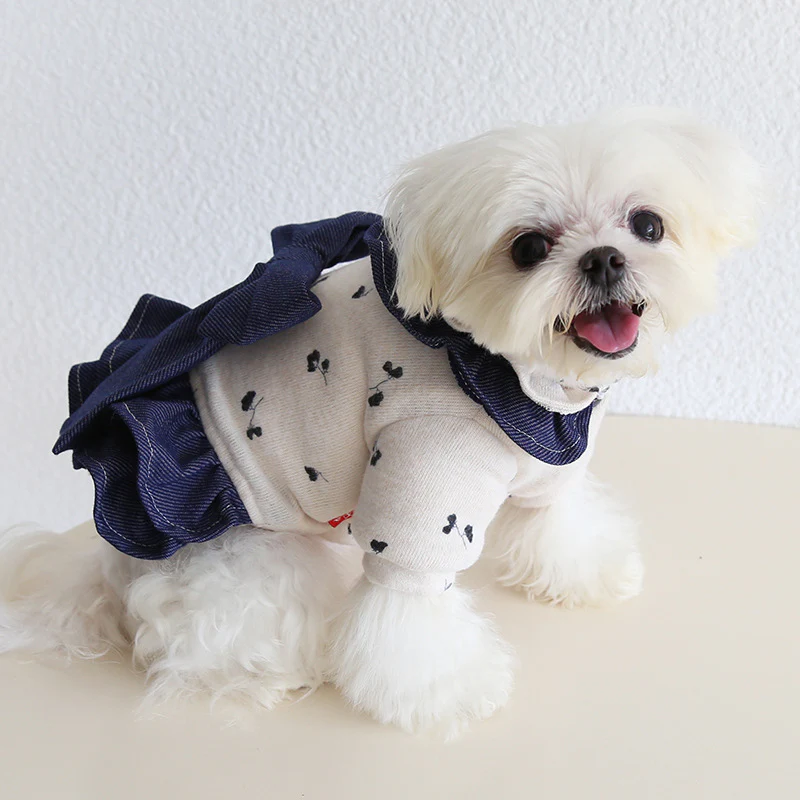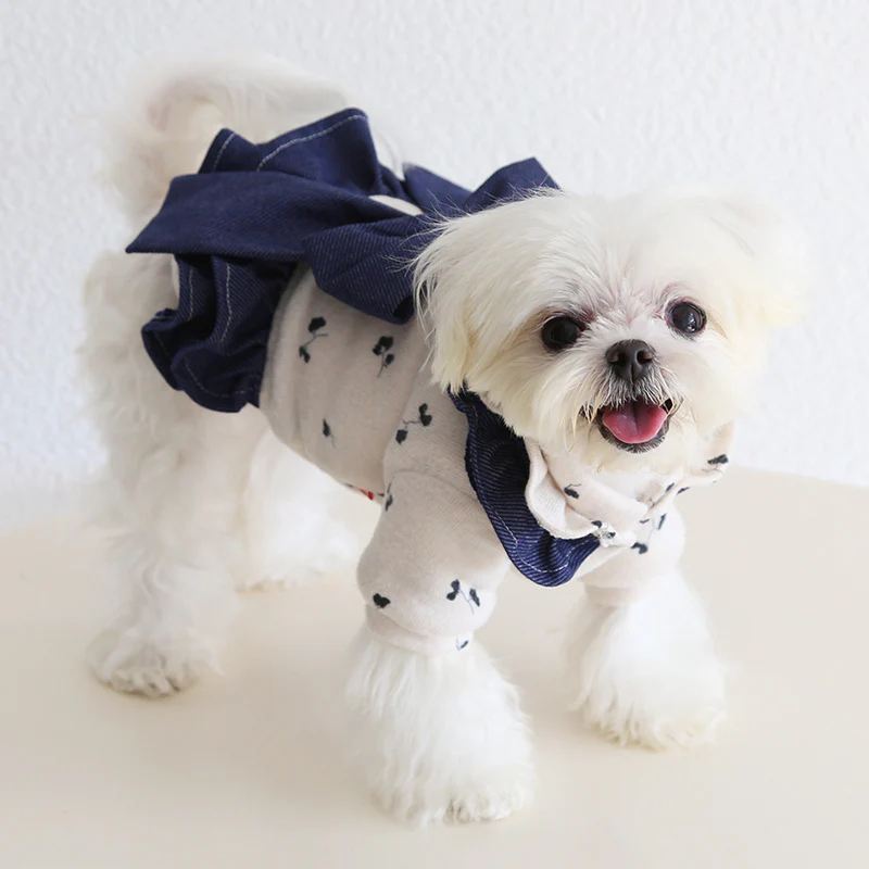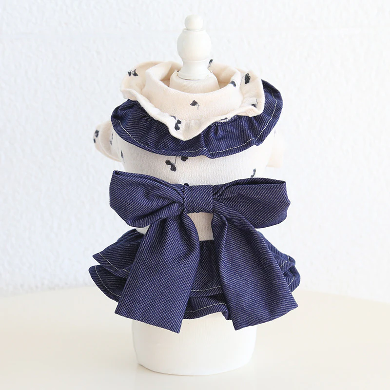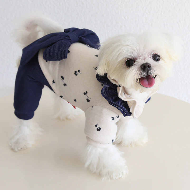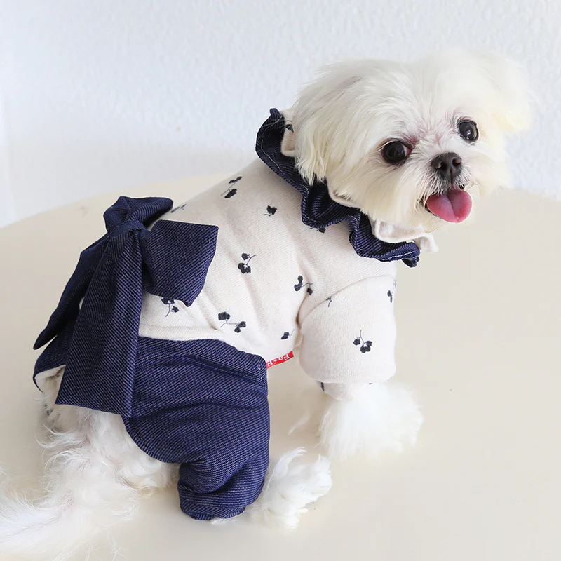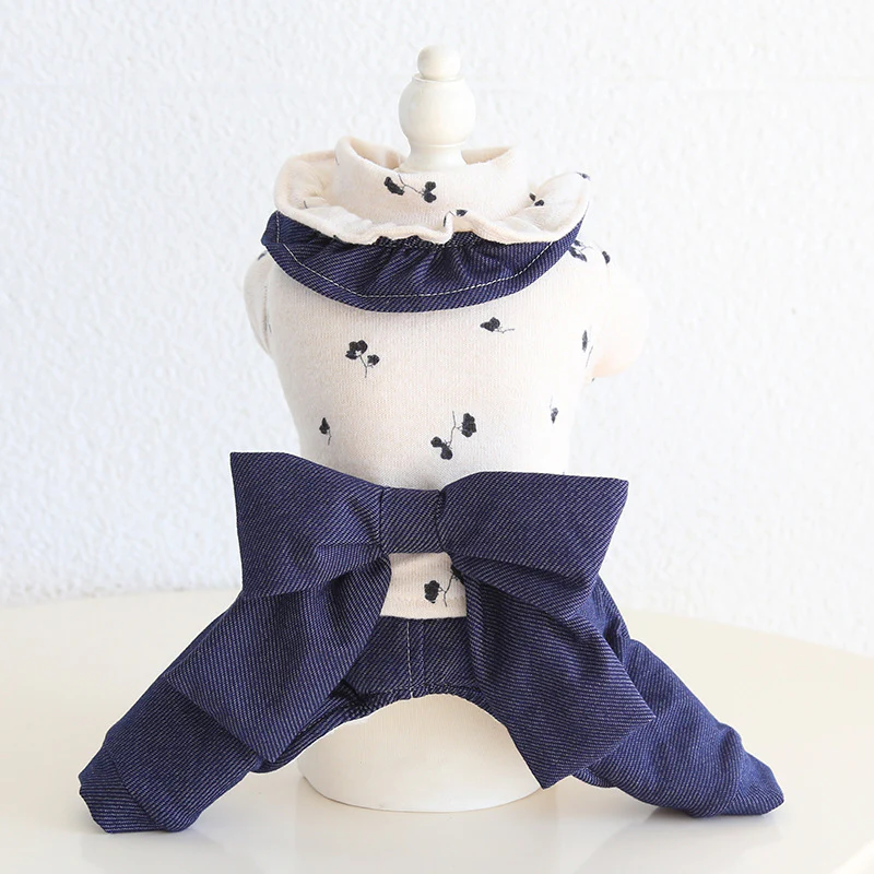 Denim Bow Decor Floral Dog Jumpsuits Dress