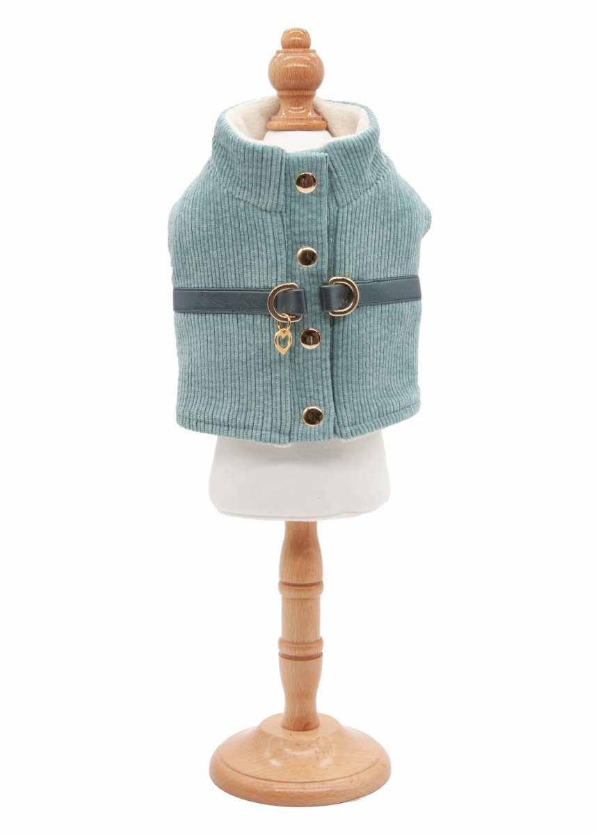 Collo alto e avvolgente, ideale per proteggere dal freddo. Inoltre presenta una banda color tiffany, alla quale è fissato un anello metallico dorato con un piccolo charm a cuore pendente, che lo rende pratico come aggancio per il guinzaglio.