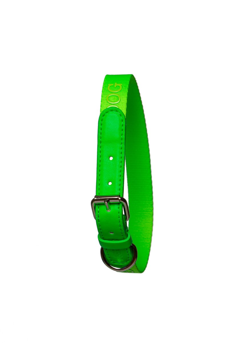 Collare fluo in tessuto con dettagli in vera pelle e scritte in silicone.