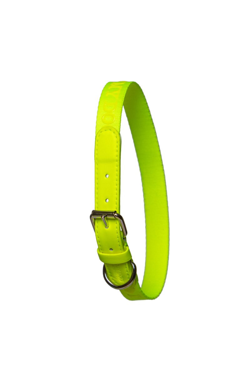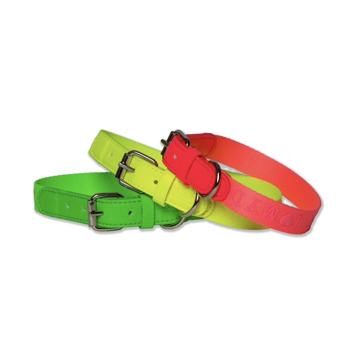 Collare fluo in tessuto con dettagli in vera pelle e scritte in silicone.