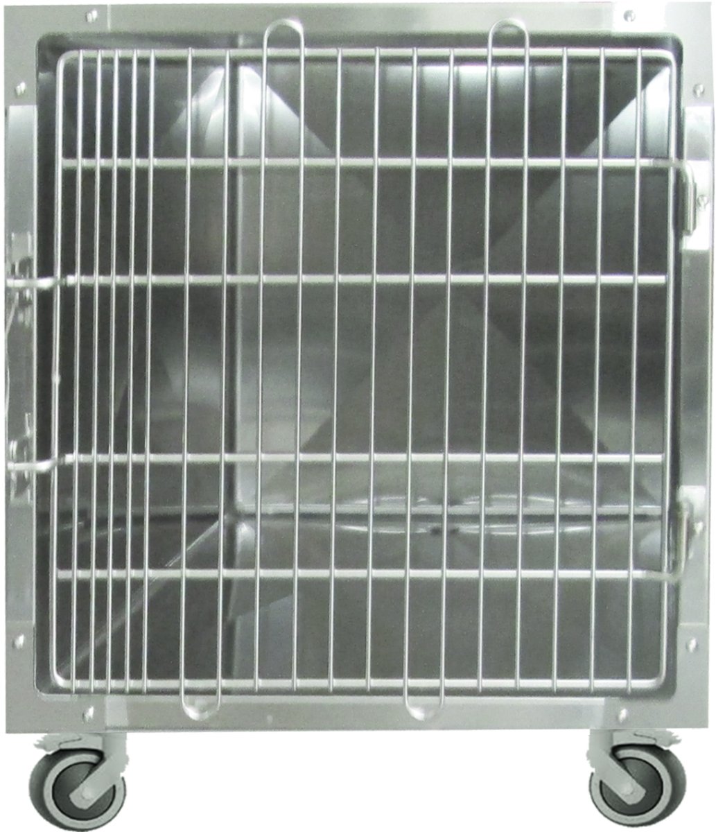 Gabbia ricovero a 1 posto: dimensioni esterne cad. posto L60,5xP72xH60,5 cm. Realizzata in acciaio inox Aisi 304. Ruote conduttive per staticità elettromagnetica, di cui 2 frenanti. Dimensioni esterne: L60,5xP72xH77 cm