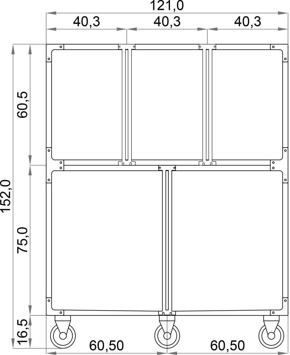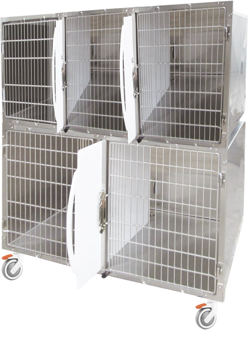 Gabbia ricovero a 5 posti: 3 nella parte superiore dimensioni esterne cada posto L40,3xP72xH60,5 cm – 2 nella parte inferiore dimensioni esterne cada posto L60,5xP72xH75 cm. Realizzata in acciaio inox Aisi 304.3 divisori estraibili in Pvc atossico, che consente di utilizzare la parte inferiore come unico ricovero. Guida divisorio estraibile per un facile posizionamento del paziente. Ruote conduttive per staticità elettromagnetica, di cui 2 frenanti. Dimensioni esterne: L121xP72xH152 cm