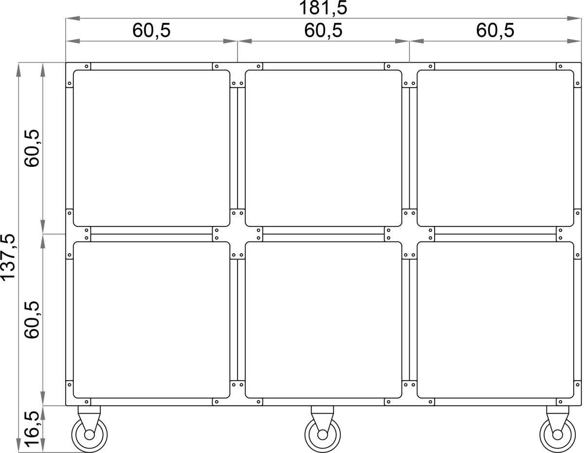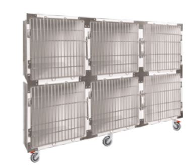 Gabbia ricovero in PVC a 6 posti : 3 nella parte superiore dimensioni esterne cada posto L60,5xP72xH60,5 cm – 3 nella parte inferiore dimensioni esterne cada posto L60,5xP72xH60,5 cm. Ruote conduttive per staticità elettromagnetica, di cui 2 frenanti. Dimensioni esterne: L181,5xP72xH137,5 cm