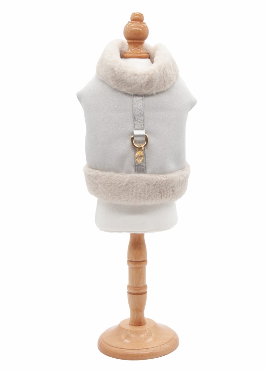 Pettorina dall’aspetto molto elegante e caldo, presenta l’esterno con un effetto scamosciato in un delicato color ghiaccio, morbido e opaco, e l’interno in pelliccia soffice, che garantisce calore