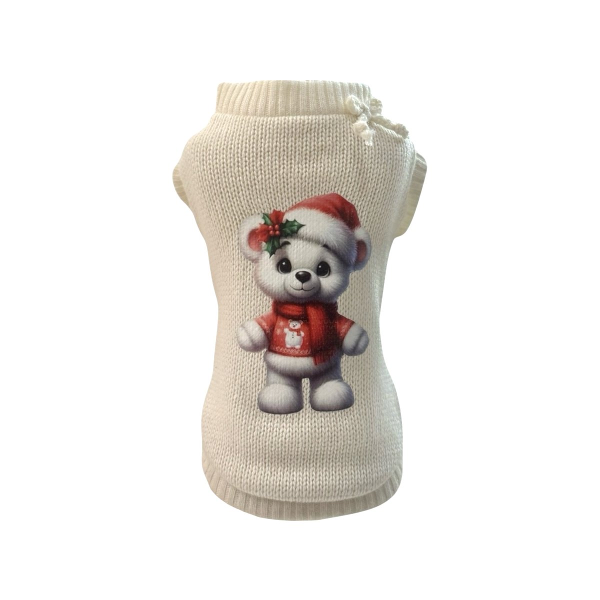 Morbidissimo maglioncino di lana con stampa orsetto impreziosita da un piccolo fiocchetto cucito.
