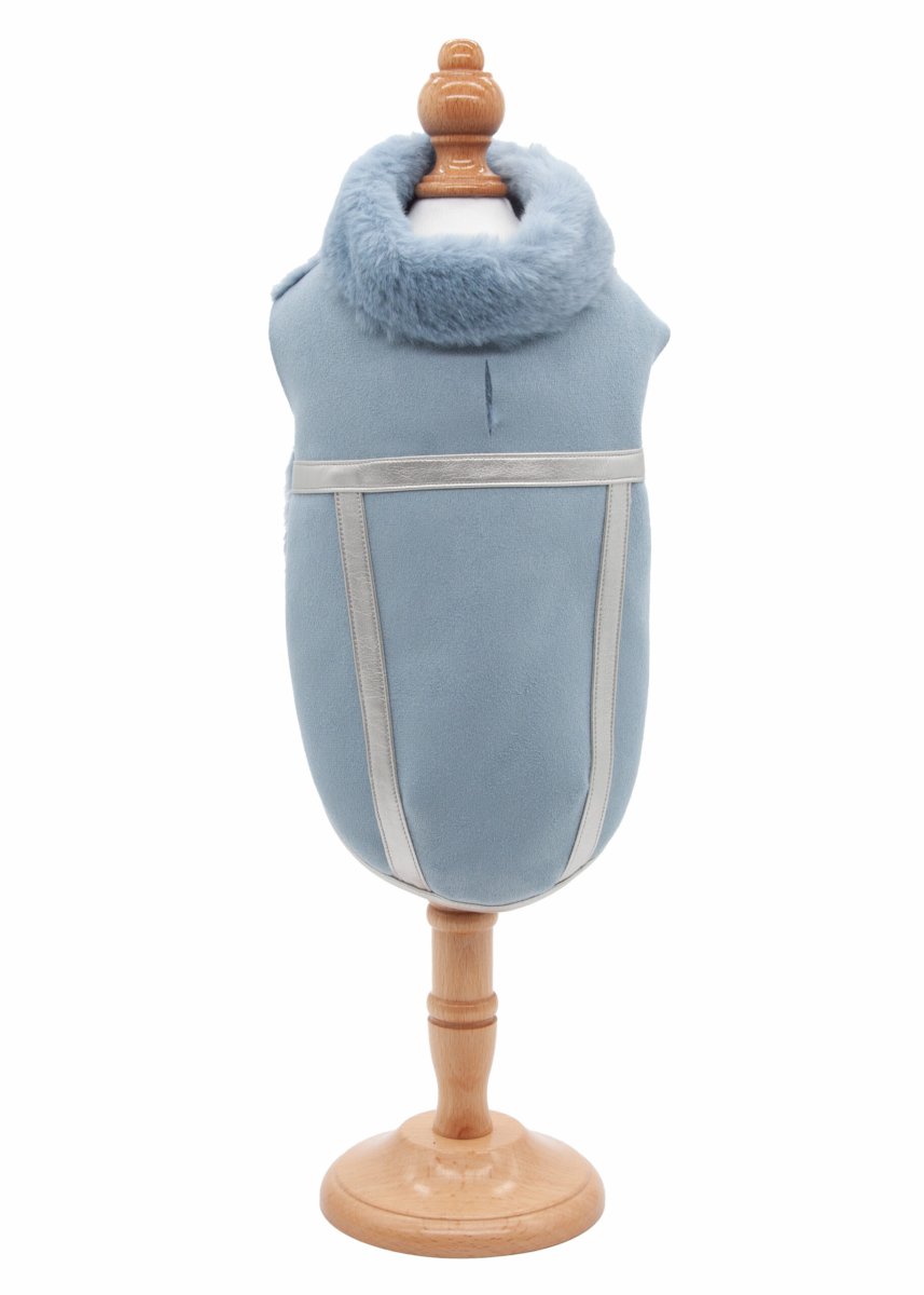 Collo alto e avvolgente, ideale per proteggere dal freddo. Inoltre presenta due bande argento che percorrono il dorso, alle quali è fissato un anello metallico dorato con un piccolo charm a cuore pendente, che lo rende pratico come aggancio per il guinzaglio.