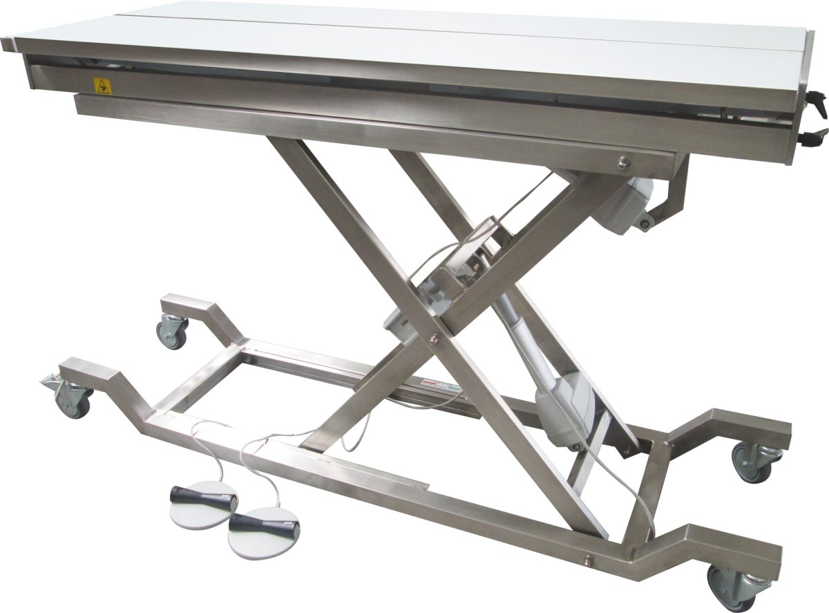 Tavolo elettrico con piano a libro e vaschetta assiale raccogli liquidi. E’ in grado di effettuare due movimenti: salita e discesa elettrico, trendelemburg elettrico. Dotato di 4 ruote di cui due frenanti.