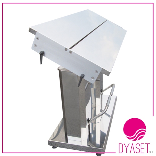 Tavolo operatorio a doppia colonna ottagonale costruito interamente in acciaio inox, movimento verticale e tredelemburg azionabile con comando a pedali e movimento laterale manuale che consente il posizionamento del paziente in assetto operatorio corretto, piano a libro e vaschetta raccogli liquidi, portata massima 100Kg. Misure: 145×55 e altezza regolabile da 90,5-104,5cm.