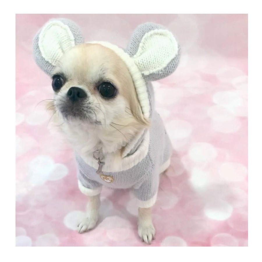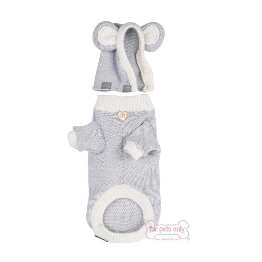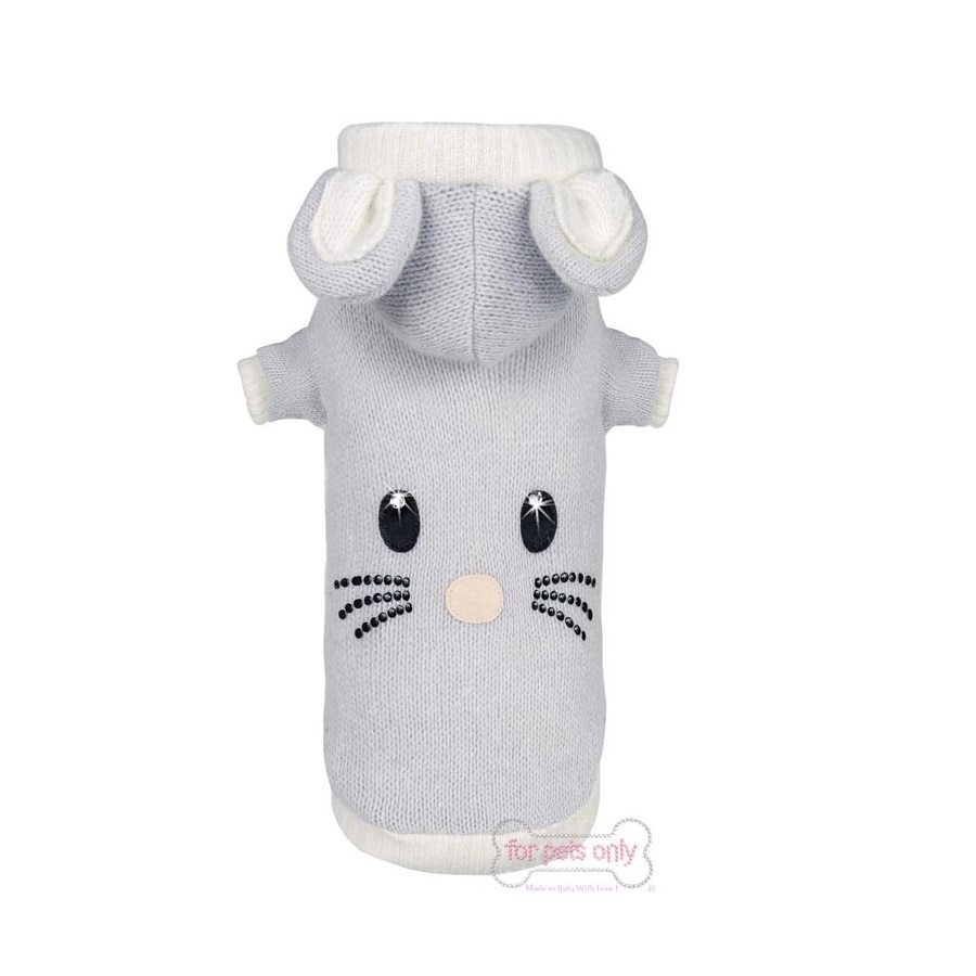 Dolcissimo pull in morbida lana grigia impreziosito dall’iconico TopoMio cristallizzato. Cappuccio con orecchiette staccabile. 100% Made In Italy