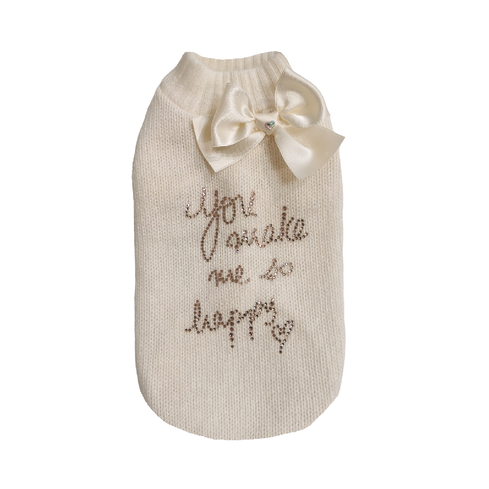 Maglioncino in lana misto cashmere con scritta in scintillanti cristalli e fiocco spilla. Morbido collo a lupetto. 100% Fatto in Italia