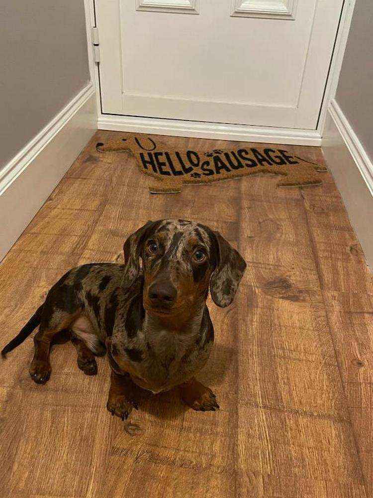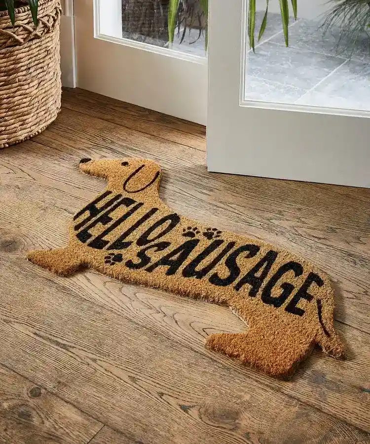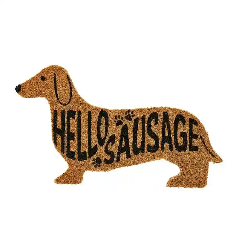 - Design esclusivo: sagoma di un adorabile bassotto con la simpatica scritta “Hello Sausage!” (tradotto “Ciao Salsiccia!”), che rende l’ingresso di casa tua allegro e accogliente.